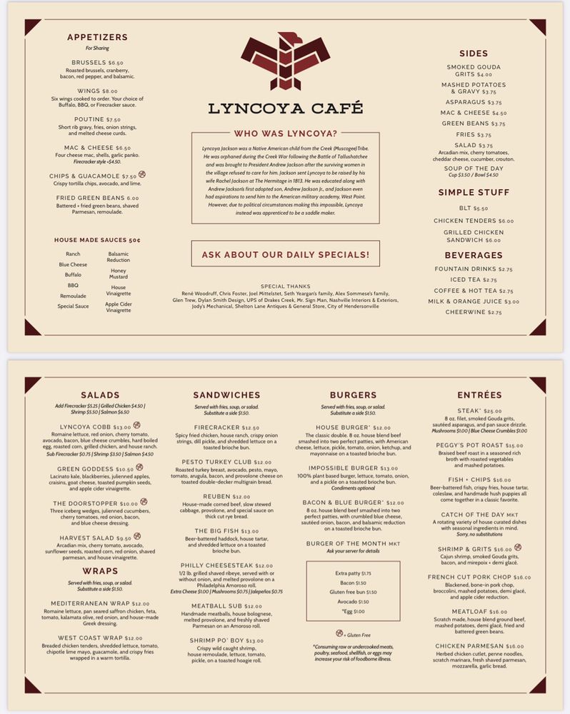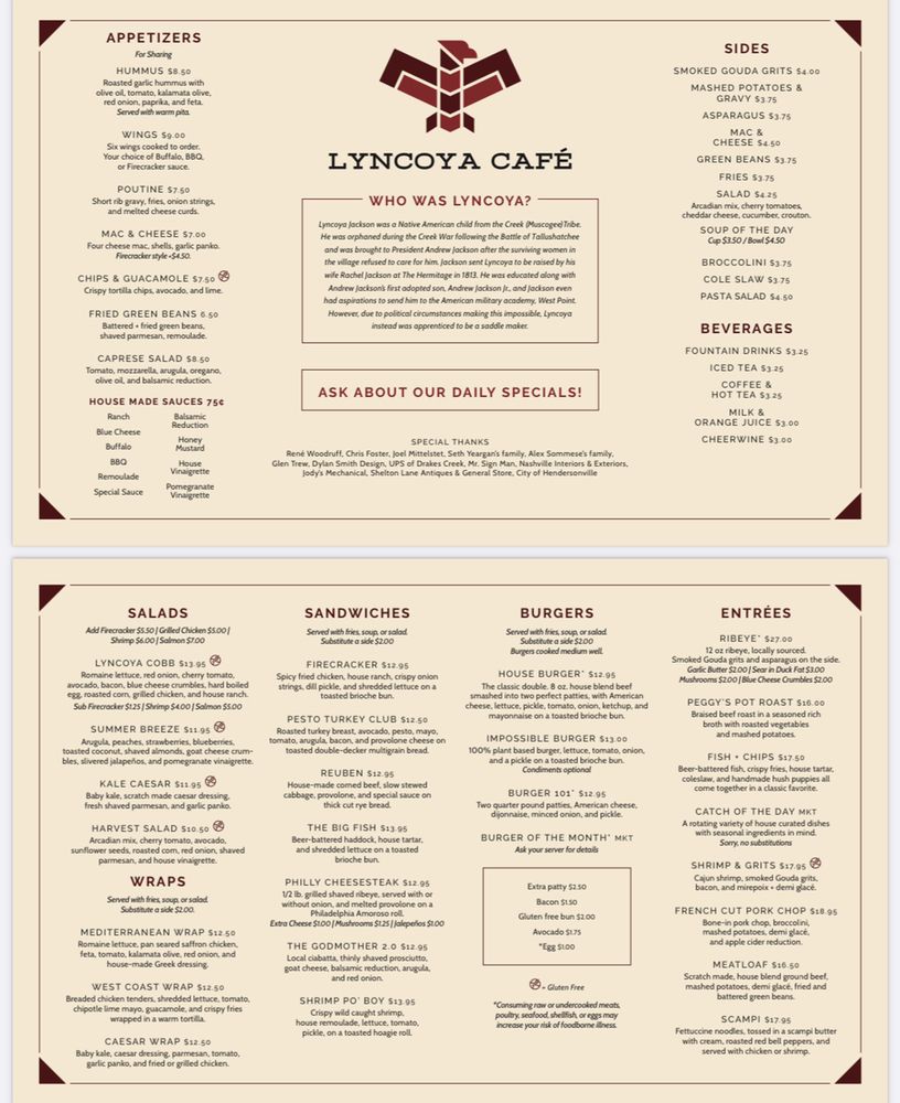 Introducing the menu at Lyncoya Cafe, a trendy and casual American salad cafe in Hendersonville, TN. With a wide range of offerings, including bruschetta, wings, and house-made sauces like ranch and blue cheese, Lyncoya Cafe caters to diverse palates. Customers rave about the fried green beans and meatloaf, praising the attentive service and family-friendly ambiance. The Poutine with short rib gravy and smoked Gouda grits are standout favorites, showcasing the kitchen's flair for preparing outstanding flavors with superb presentation. Despite the slightly higher prices for drinks, the overall dining experience at Lyncoya Cafe receives high praise for its delicious dishes and welcoming atmosphere. Don't miss out on trying the various menu options, as this cafe promises a memorable dining experience for all.